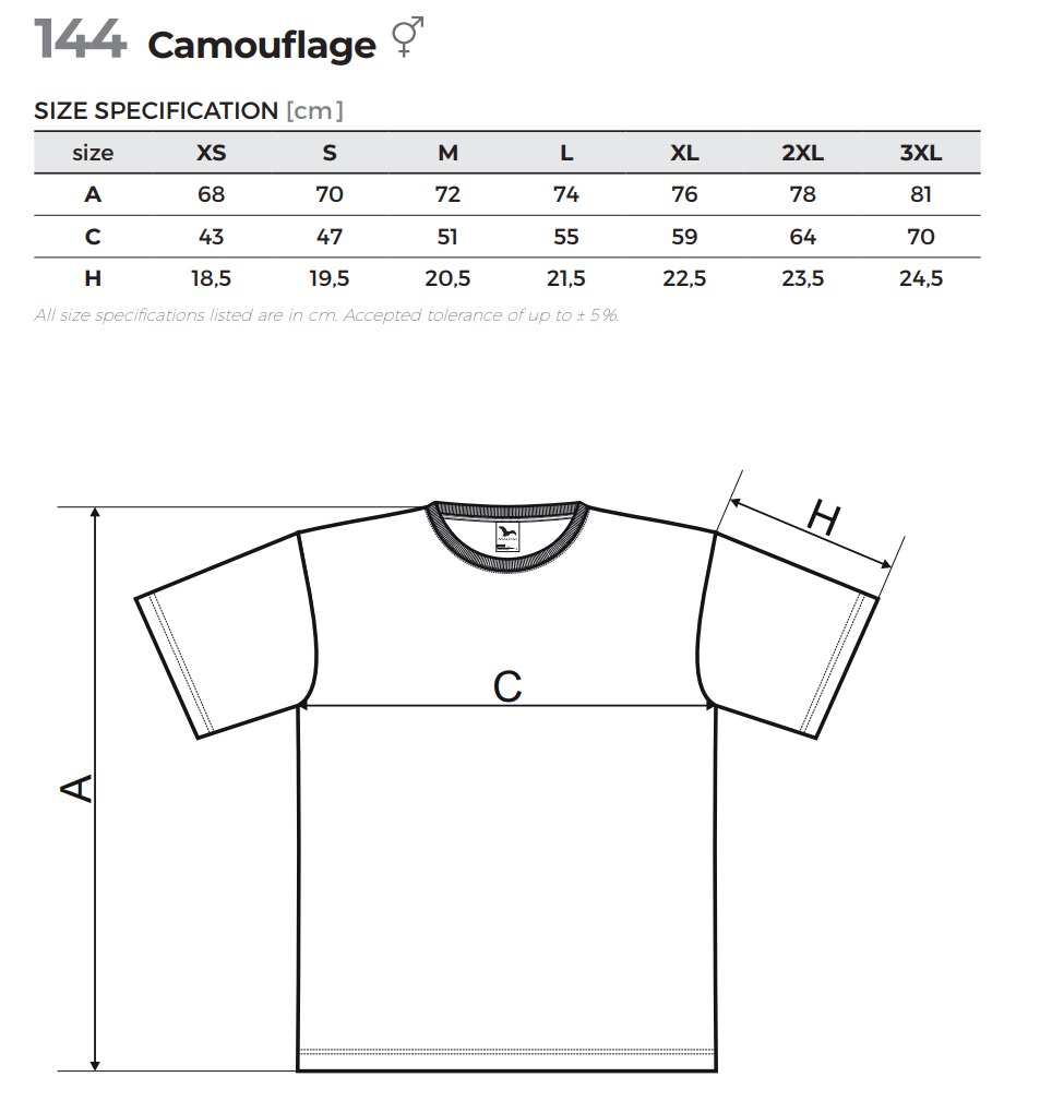 Krój: Koszulka ma klasyczny krój ze szwami bocznymi, co zapewnia doskonałe dopasowanie. Wąska lamówka z dzianiny ściągaczowej 1:1 z dodatkiem 5% elastanu oraz taśma wzmacniająca na ramionach w kolorze camouflage dodają trwałości i stylu.