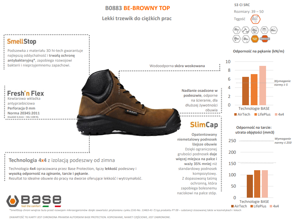 - Technologia 4x4 opracowana przez Base Protection, łączy lekkość podeszwy i wysoką odporność na zginanie, tarcie i pękanie. Rezultat to idealne obuwie do pracy na dworze oferujące lekkość i wytrzymałość.